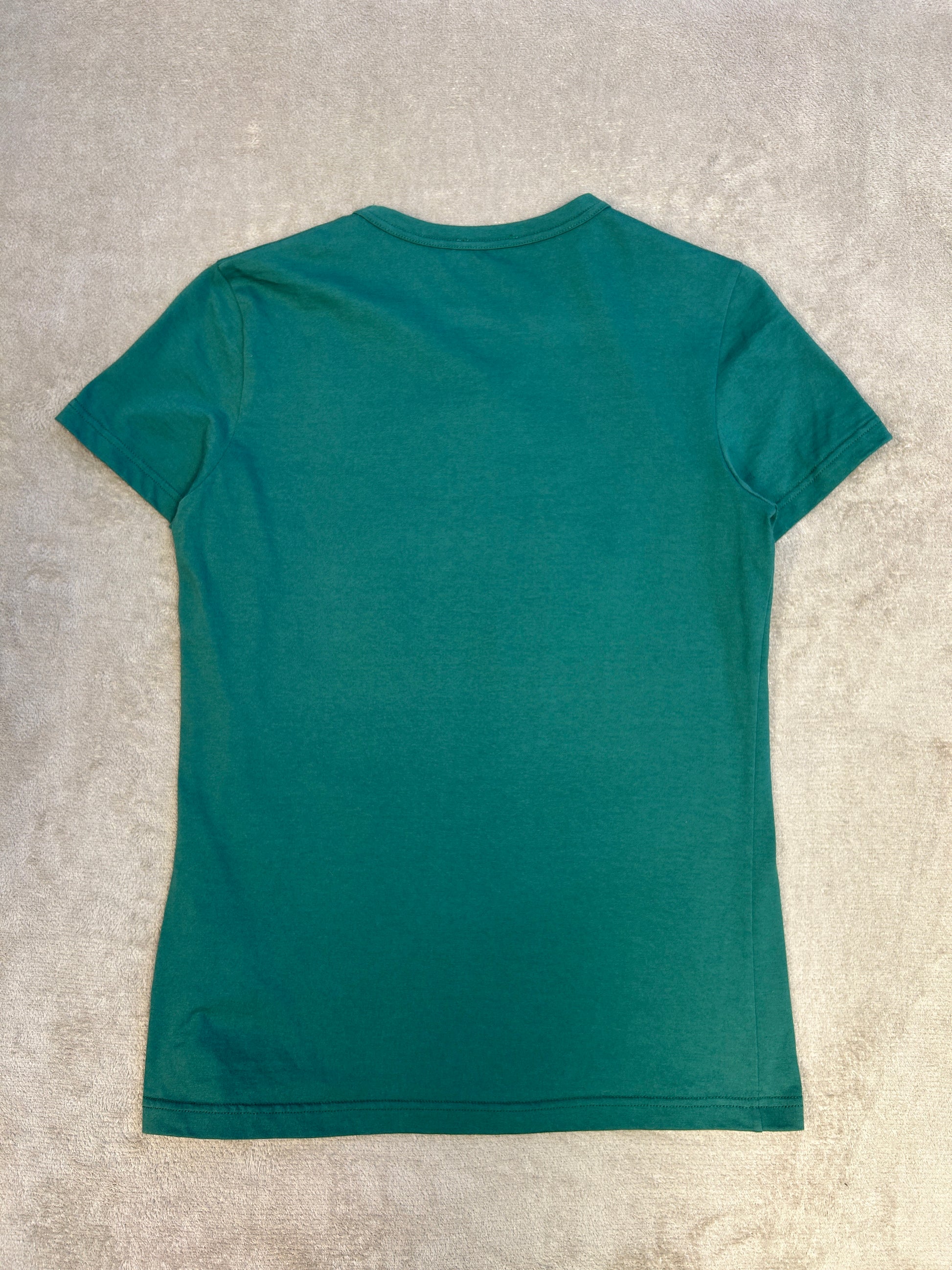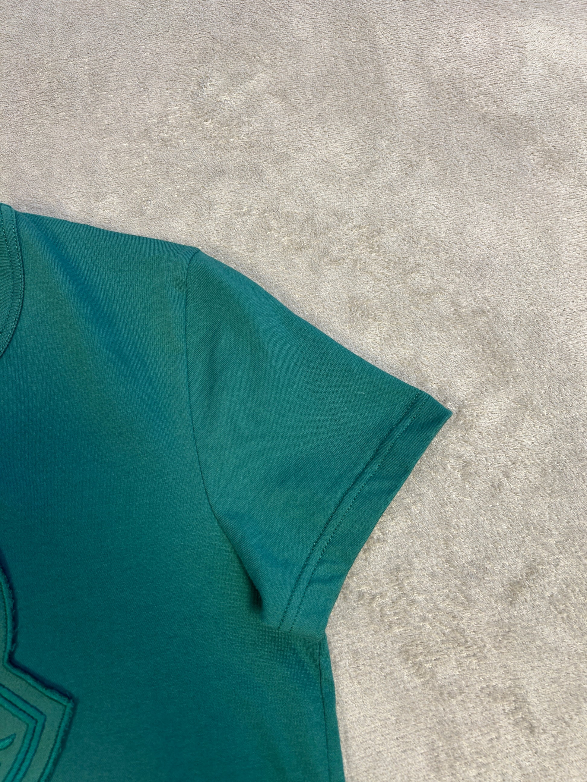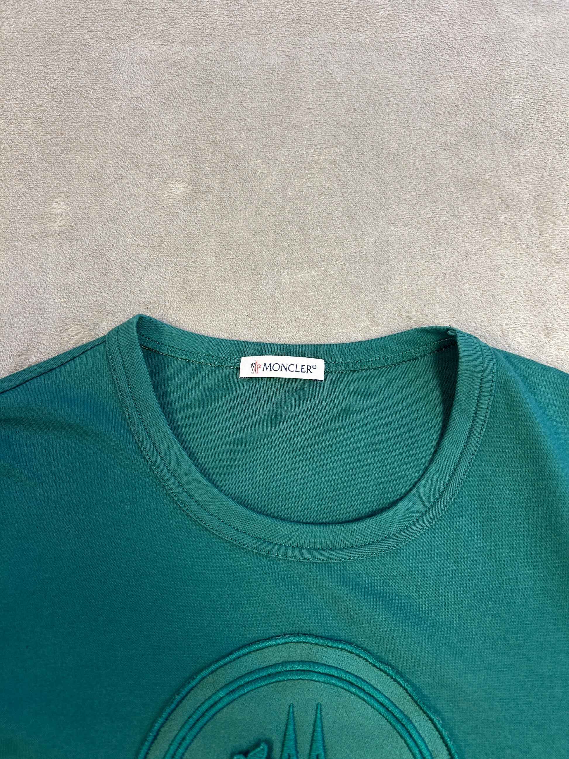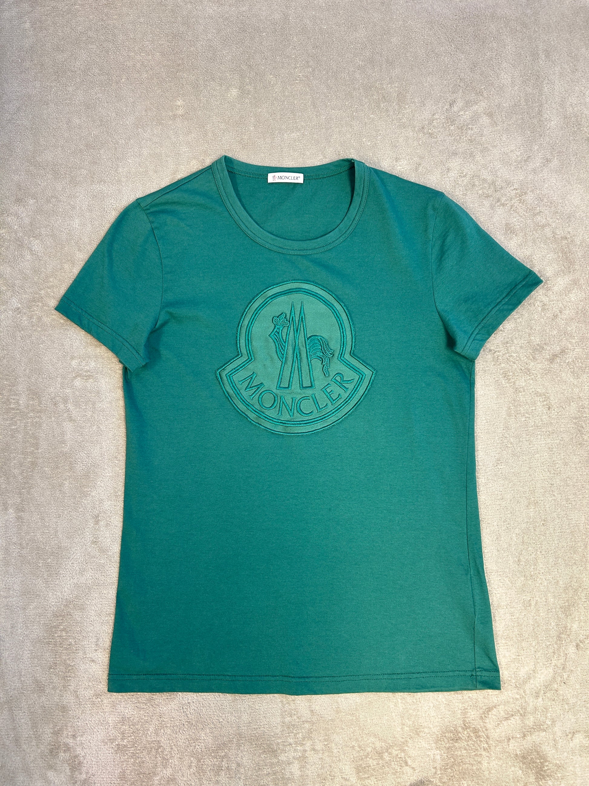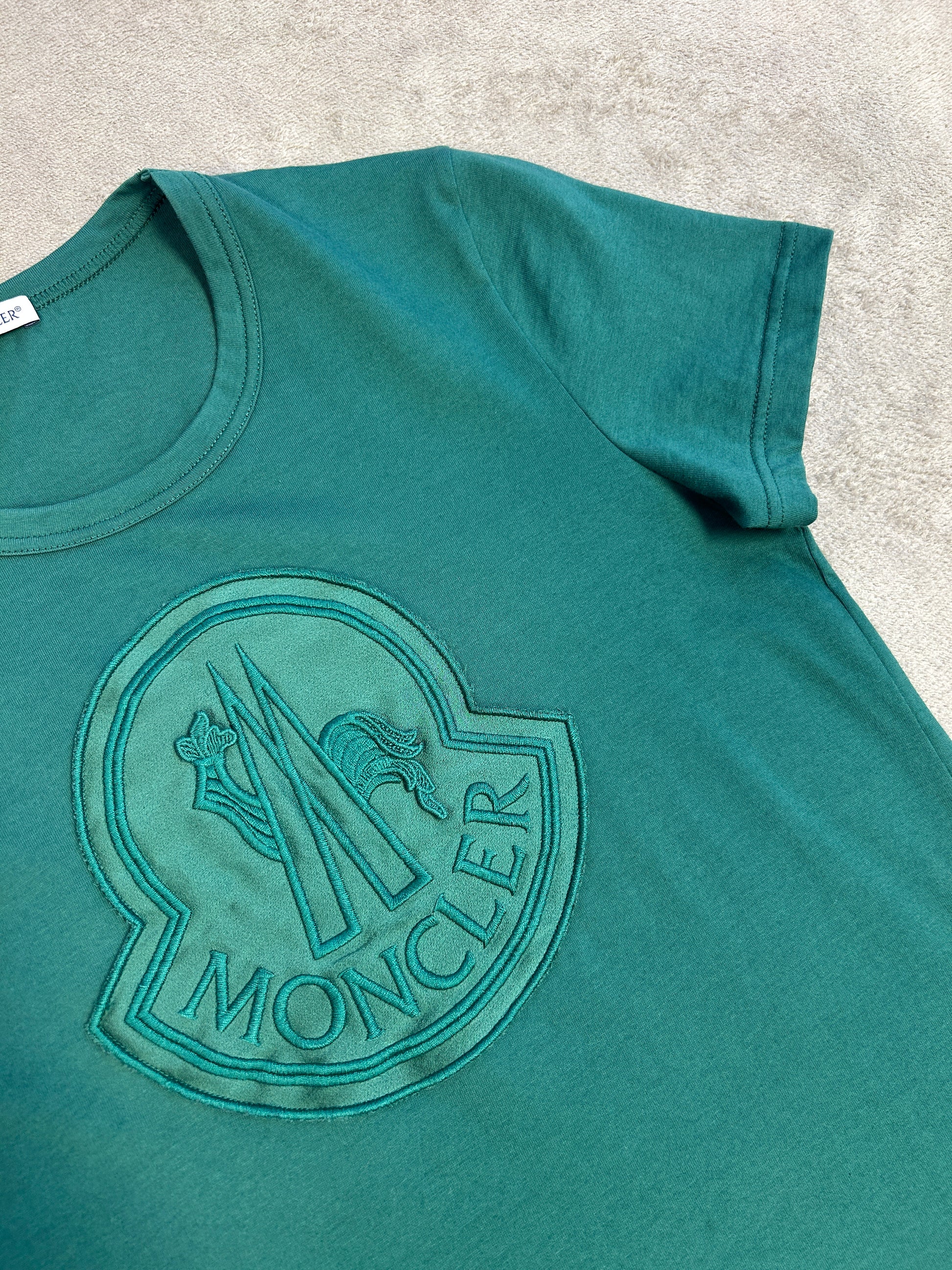 This Moncler t-shirt is a clean and sophisticated piece, perfect for adding a touch of luxury to your everyday look. In a beautiful green shade, it features a unique, large embossed logo on the chest, giving it a subtle and textural design. The classic crewneck and comfortable cotton construction make it a versatile staple for any wardrobe. In excellent condition, this t-shirt is a great find.